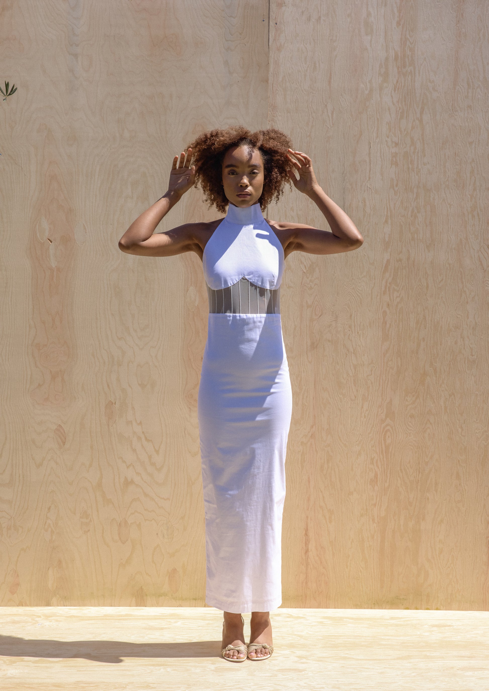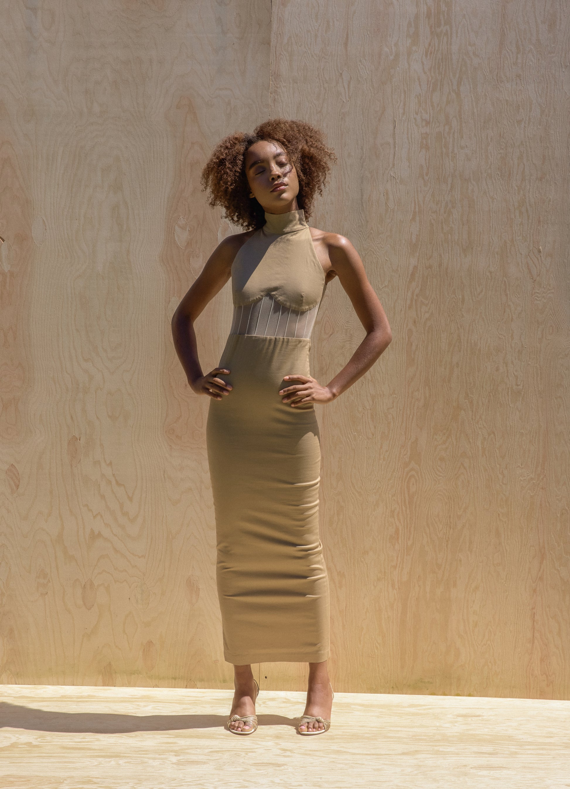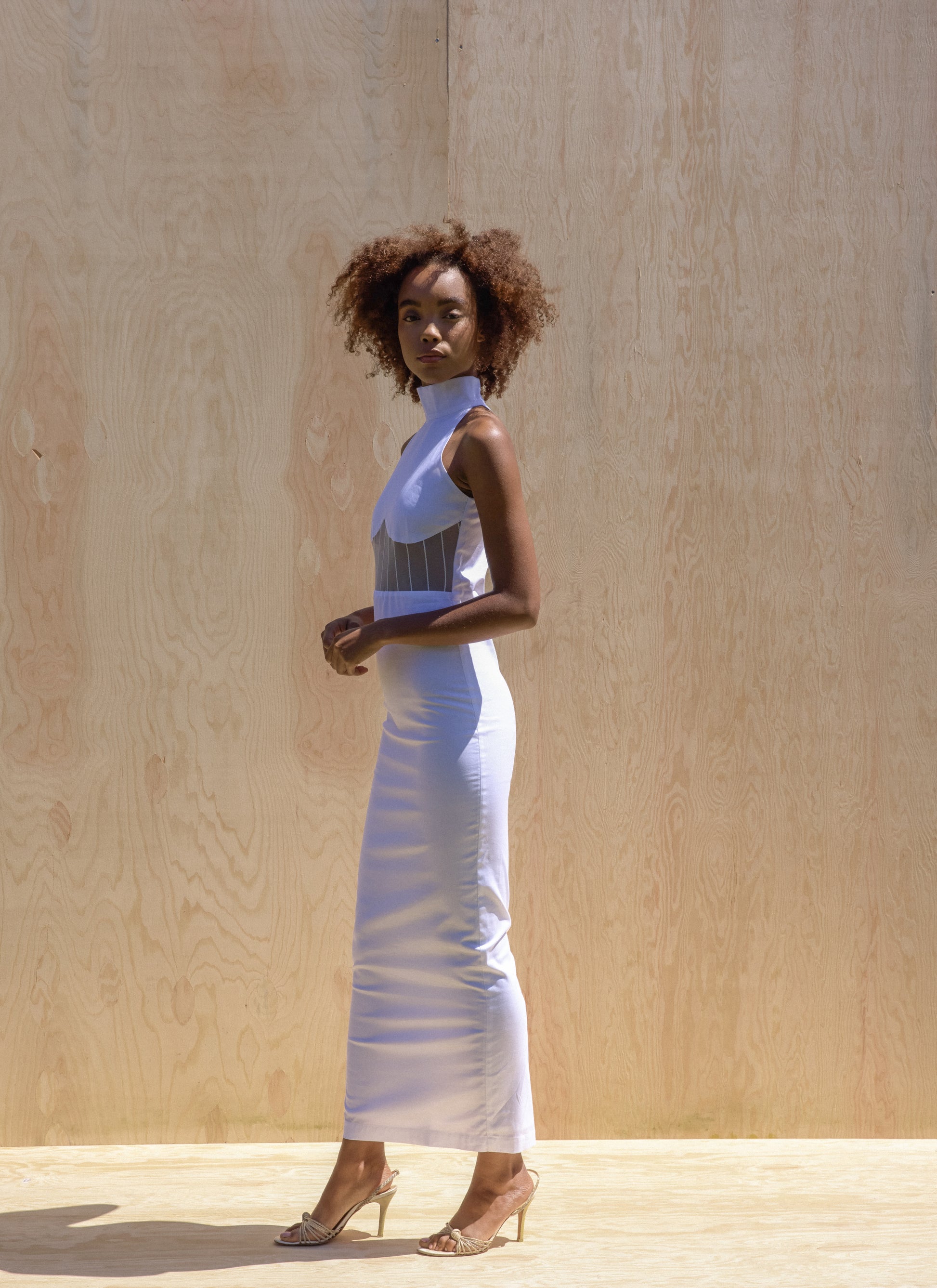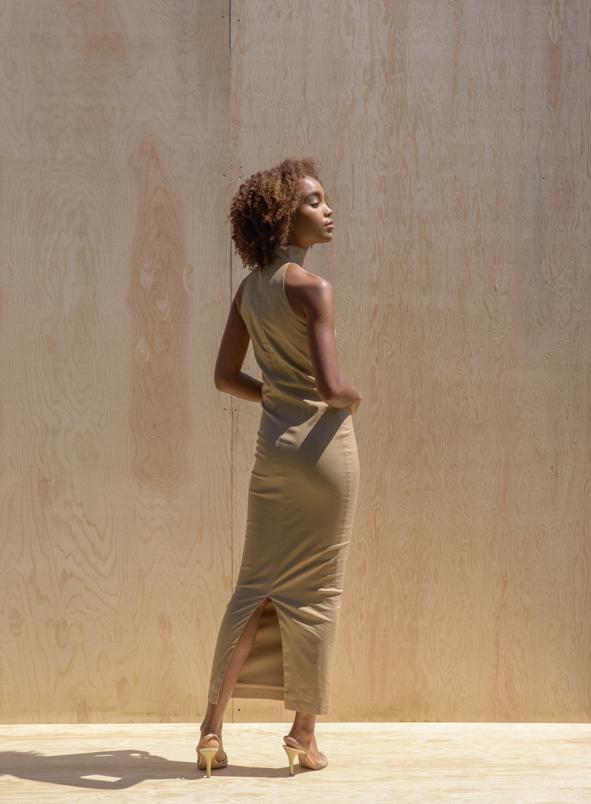 The Negev-2.0 Dress in our cotton poplin fabric is re-invented from our classic Negev Dress. Designed with a sheer mesh cut-out around the upper waist, a fitted turtle-neck and a mid-high slit in the back making this form-fitting dress a must have this season.